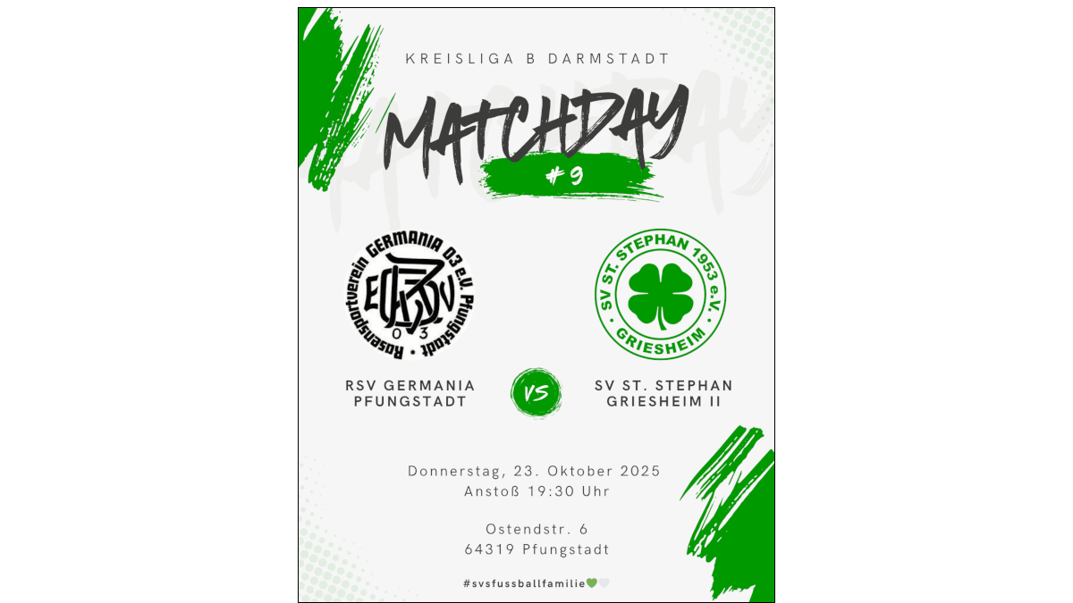 Am kommenden Donnerstag, dem 23. Oktober, steht für die Zweite Mannschaft des SV St. Stephan ein schwieriges Auswärtsspiel auf dem Plan. Ab 19.30 Uhr gastiert man bei Germania Pfungstadt. Die Pfungstädter stehen mit 24 Punkten und einem Torverhältnis von 54:31 auf dem vierten Tabellenplatz der Kreisliga B Darmstadt. Mit den 54 Treffern aus 11 Begegnungen stellt die Germania die beste Offensive der Klasse, doch die 31 Gegentore bedeuten auch den Negativ-Wert der oberen Tabellenhälfte. Das Kleeblatt-Team wird sich auf angriffslustige Pfungstädter einstellen müssen. Wenn es aber gelingt, die bisher an den Tag gelegte Defensivleistung mit erst vier Gegentreffern abzurufen, sollte man auch bei der Germania die Siegesserie weiter ausbauen können.