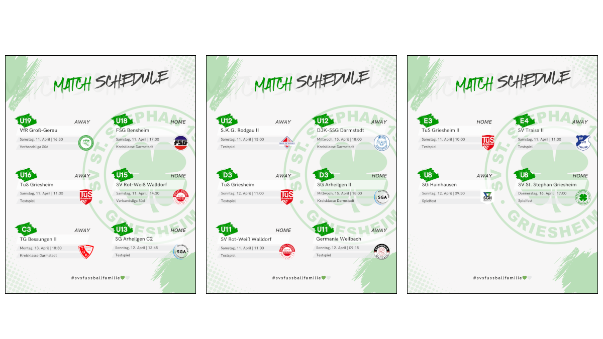 Am kommenden Sonntag, dem 12. April, bestreiten die beiden Fußball-Teams des SV St. Stephan Auswärtsspiele. Die Erste gastiert ab 13 Uhr bei VfR Groß-Gerau II und die Zweite ab 15 Uhr bei Kamerun Darmstadt.